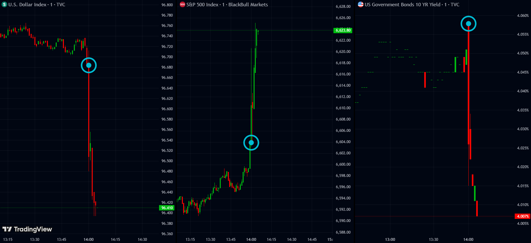 Markets would likely cheer the softer stance — equities rally, the USD falls, and Treasury yields drop as traders price in more cuts ahead.