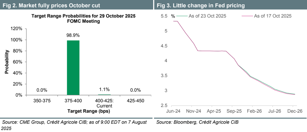 The Fed is expected to cut rates by 25bps to 3.75–4.00% and end balance sheet runoff at its October meeting. Policymakers will likely acknowledge recent economic resilience but keep their focus on supporting the labor market. With limited official data due to the government shutdown and ongoing uncertainty around employment trends, Powell is unlikely to give forward guidance beyond this meeting — reinforcing a cautious “fly-by-instruments” approach.