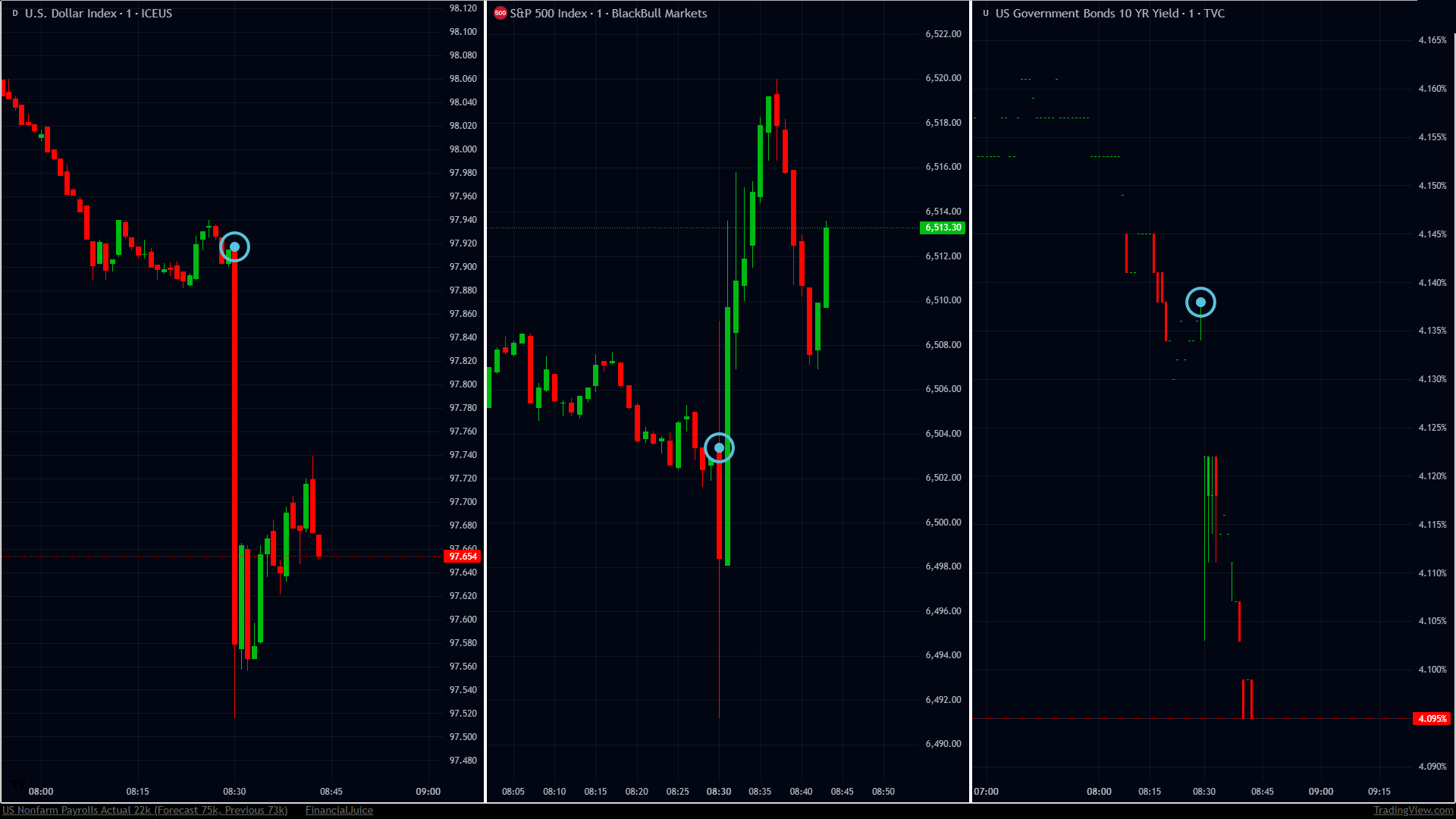 This caused weakness in the dollar and government bond yields, and strength in US stocks, as traders increased bets on Fed rate cuts in order to stuimulate a weakening job market.